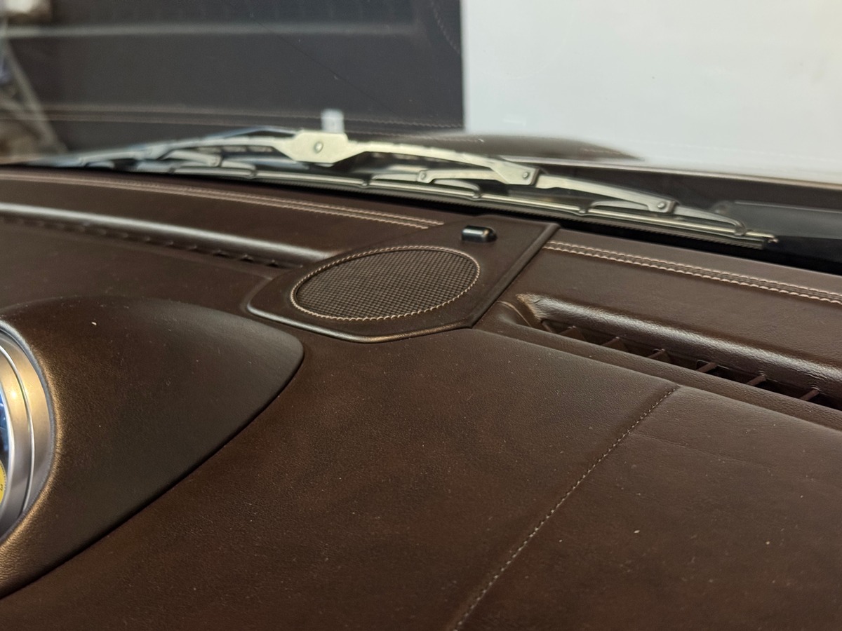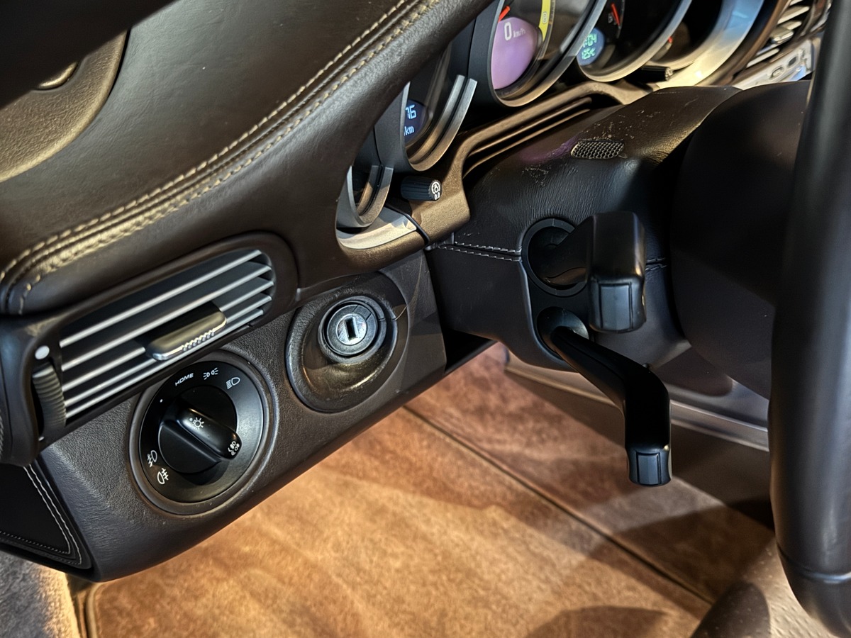 La voiture est également équipée de freins céramique PCCB, dont l’état a été contrôlé et validé par Porsche, confirmant leur excellente condition. Un système de by-pass commandé par télécommande a été installé sur les valves d’échappement, permettant d’ajuster la sonorité avec précision, tout en conservant une configuration respectueuse de l’origine.