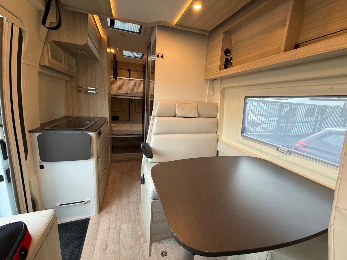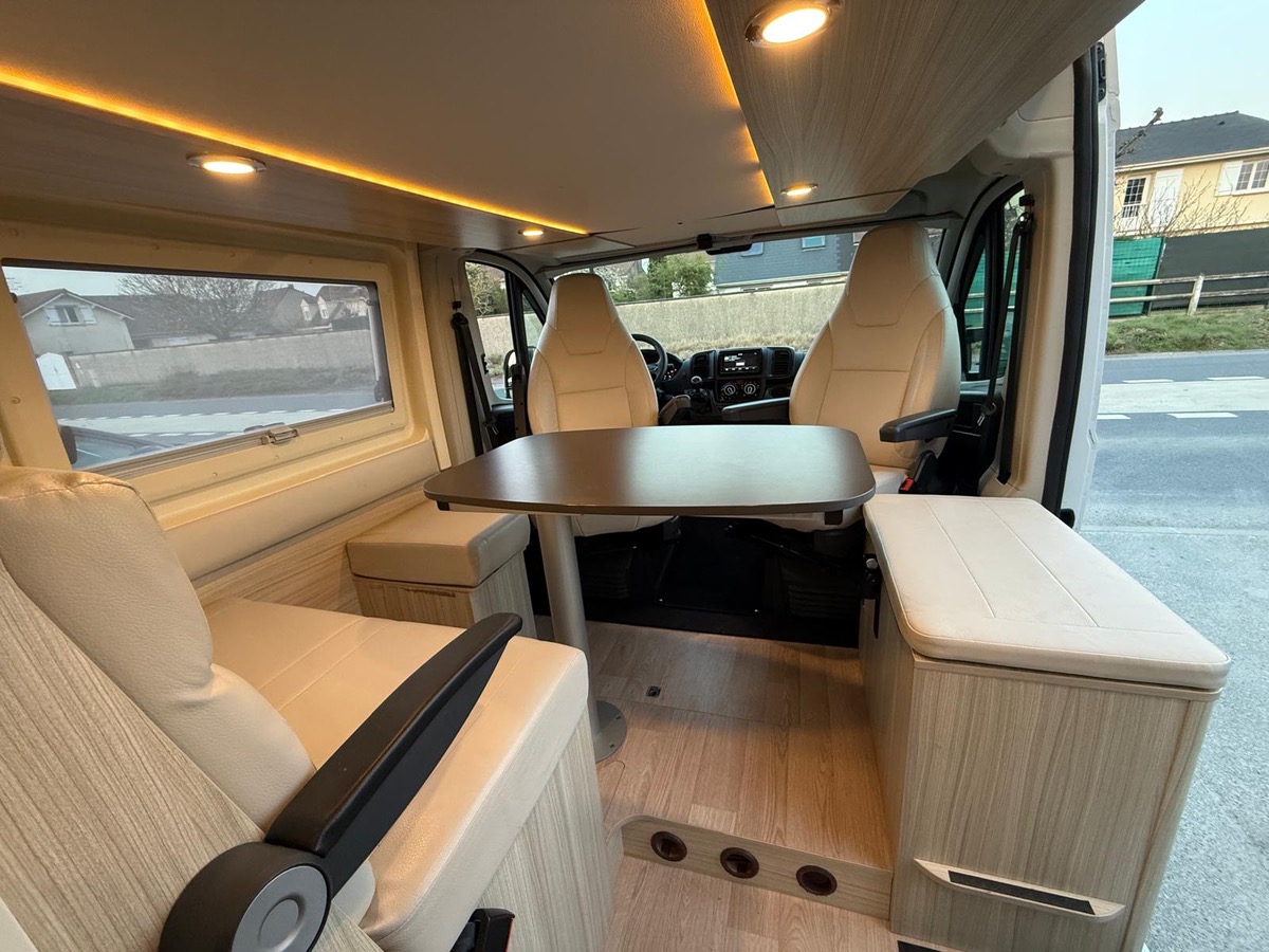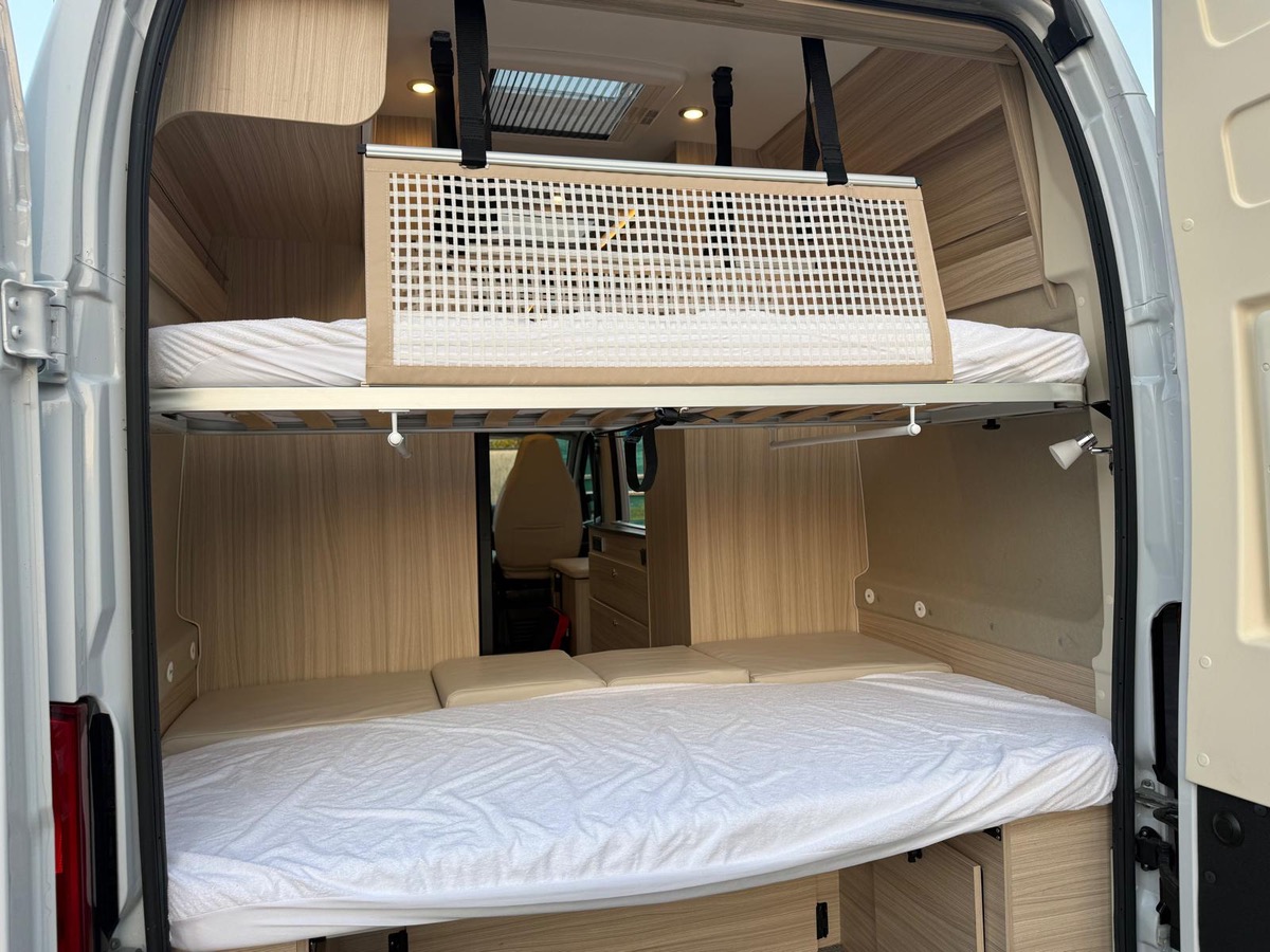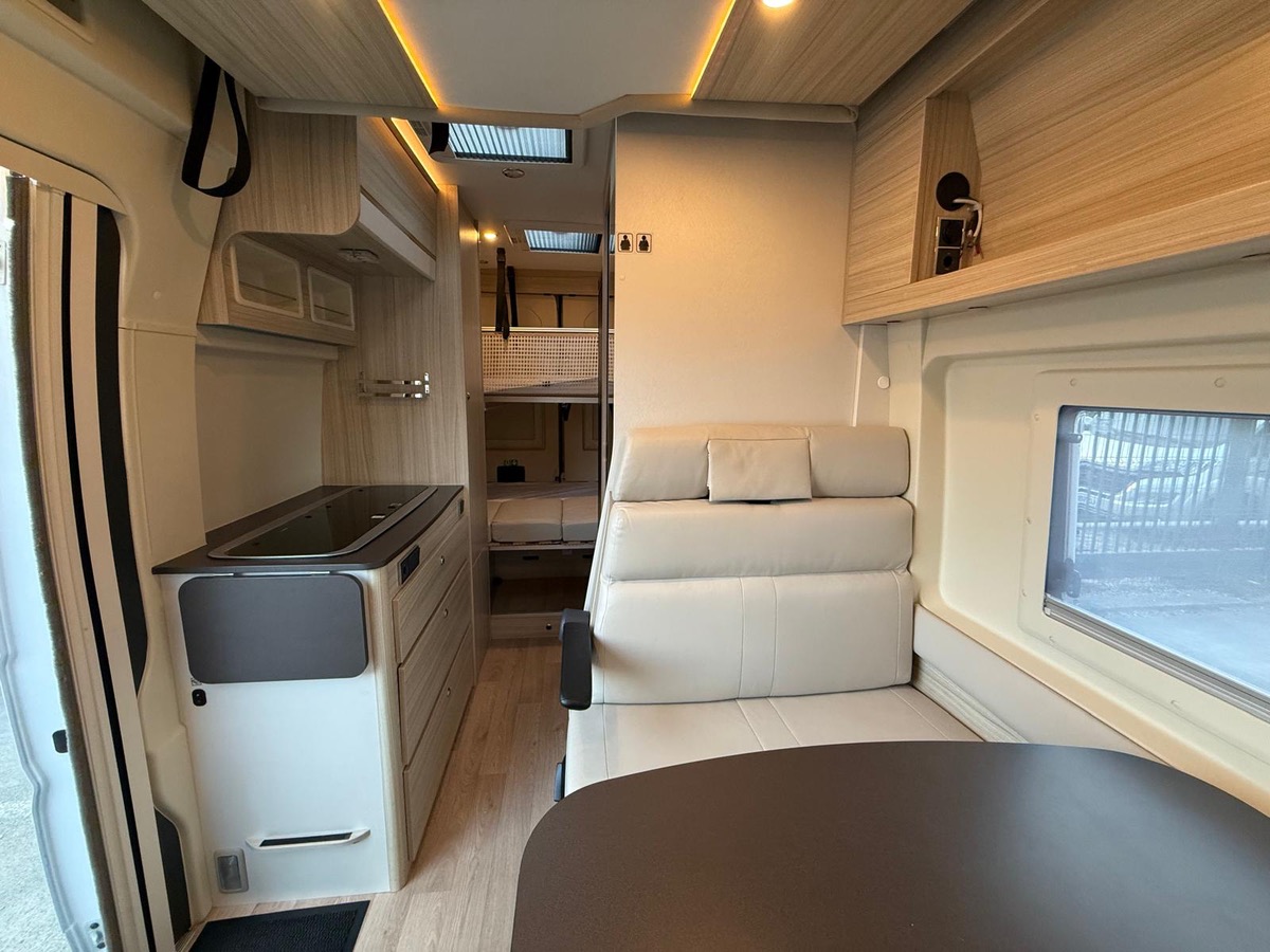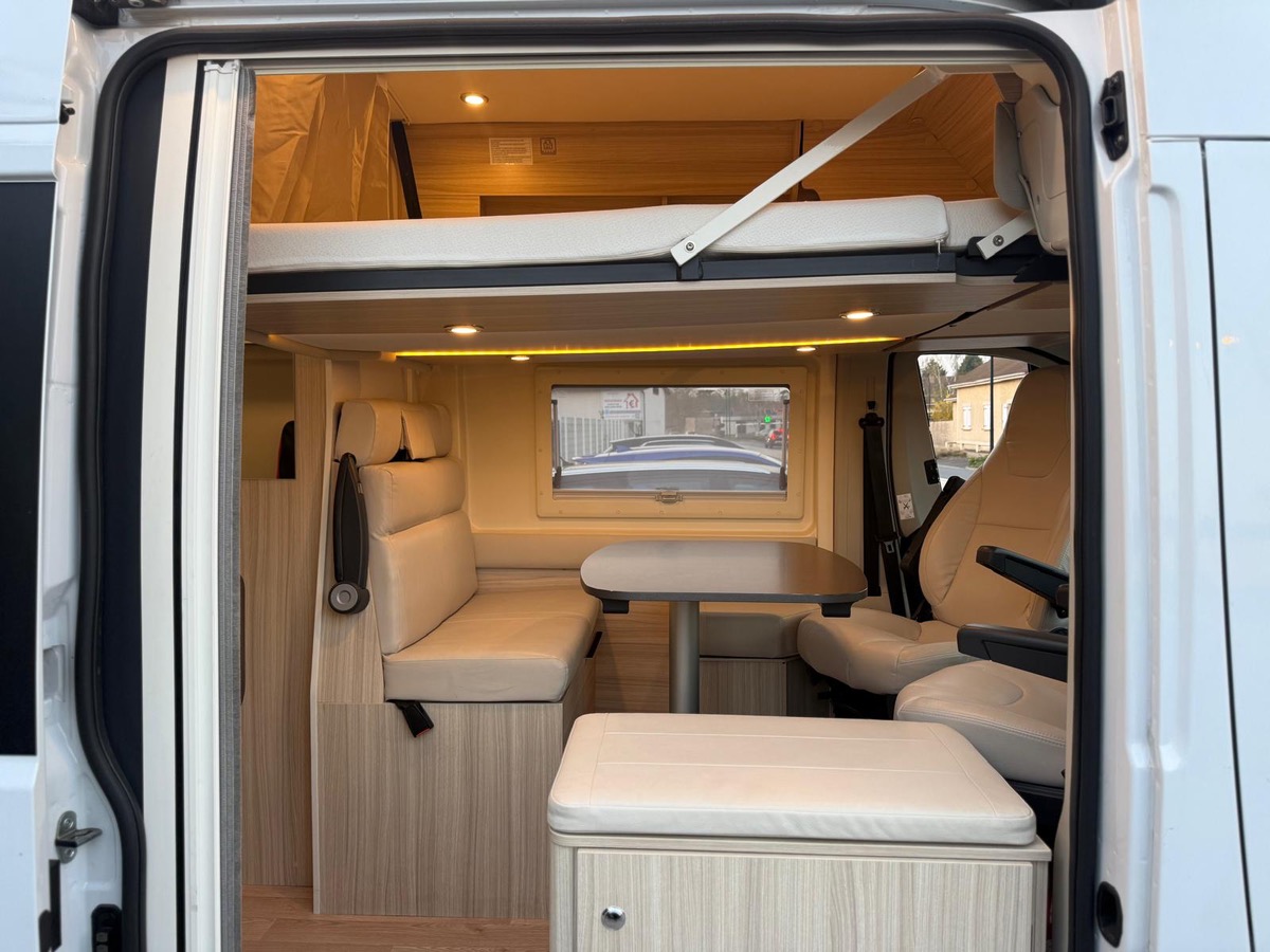 Fourgon aménagé familial comprenant un salon avant panoramique, une salle d’eau avec douche et WC, des lits superposés arrière avec salon enfant, une cuisine avec de nombreux rangements et un lit de pavillon 2 places. 5 places couchage et 5 places carte grise.