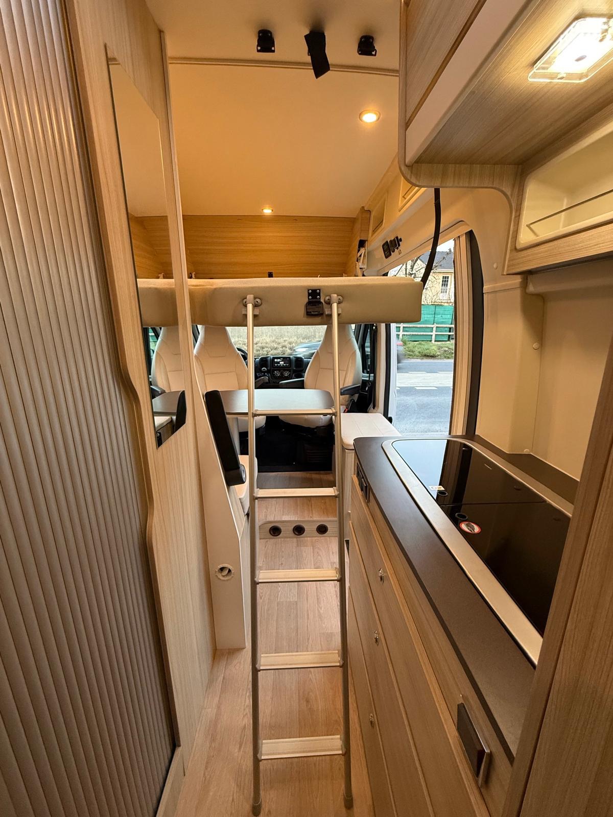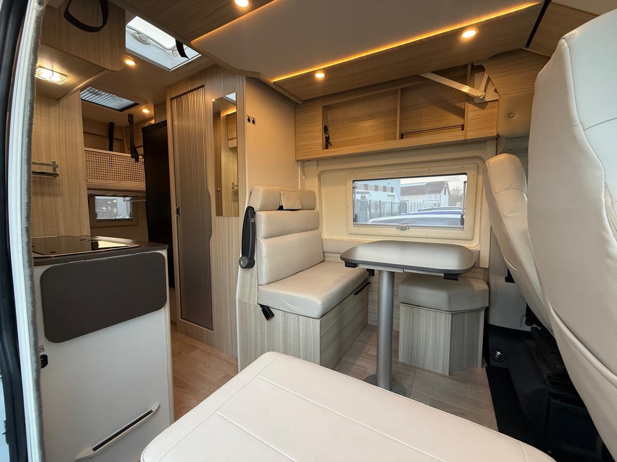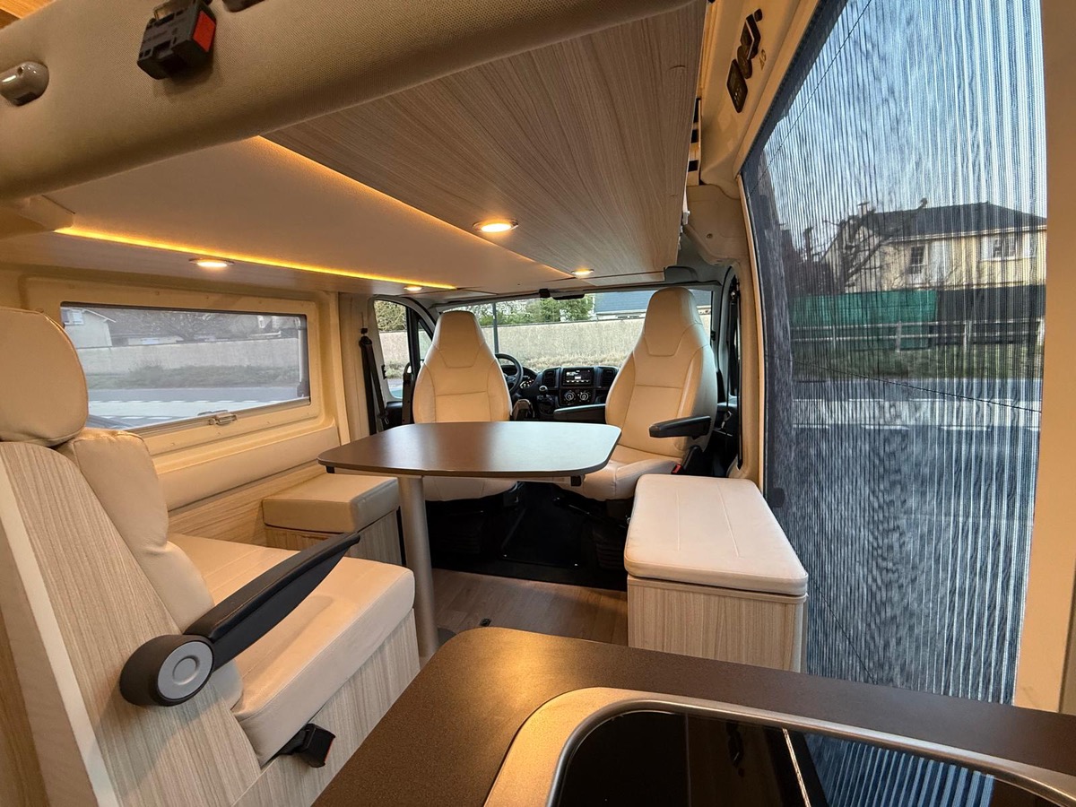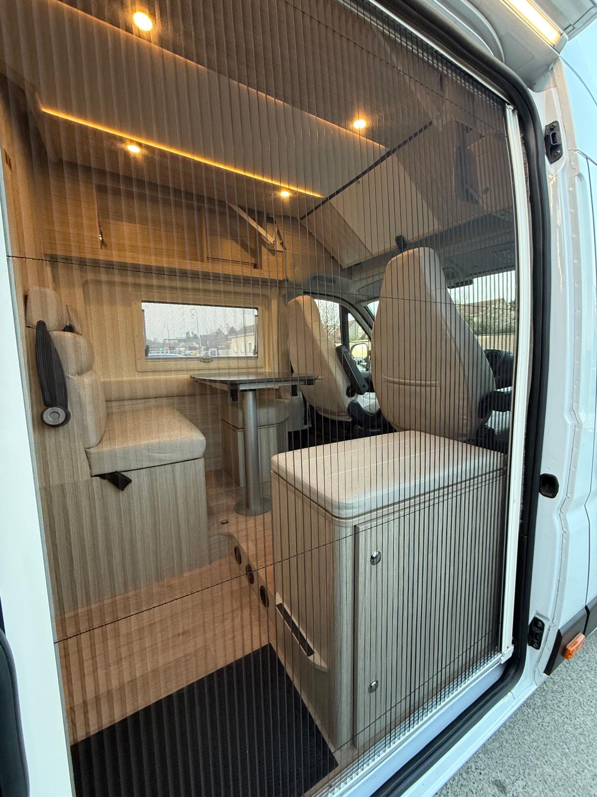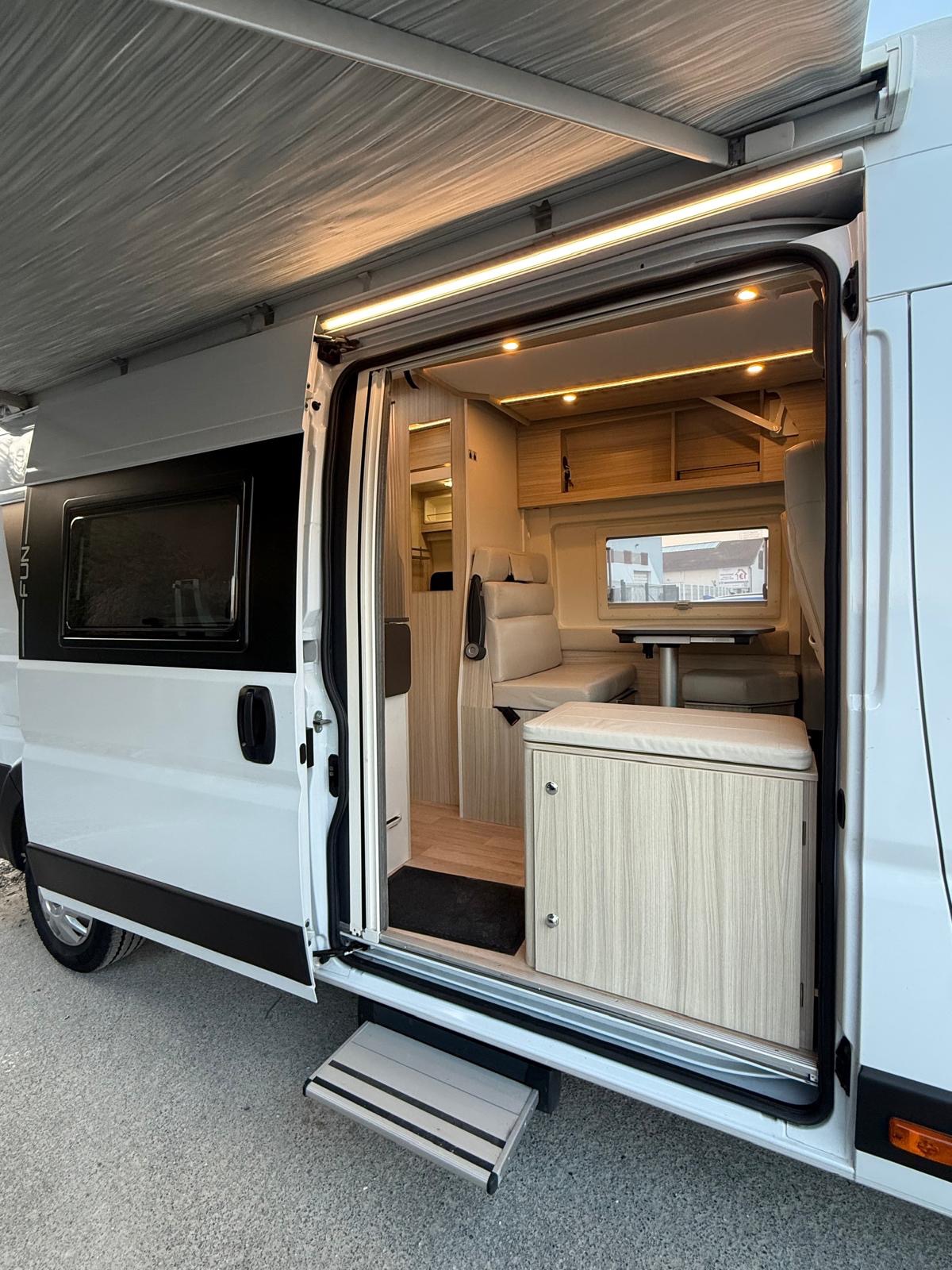 Fourgon aménagé familial comprenant un salon avant panoramique, une salle d’eau avec douche et WC, des lits superposés arrière avec salon enfant, une cuisine avec de nombreux rangements et un lit de pavillon 2 places. 5 places couchage et 5 places carte grise.