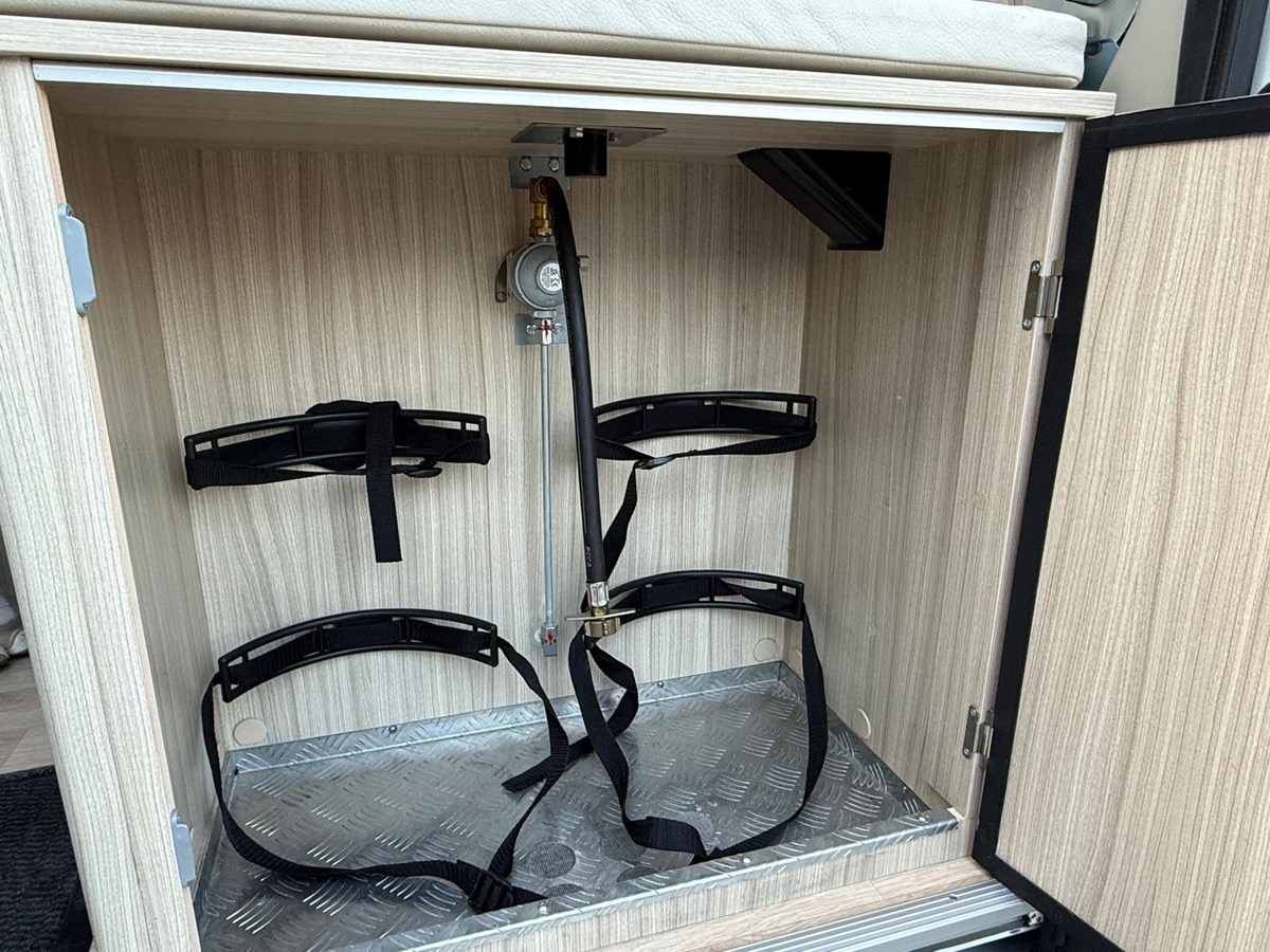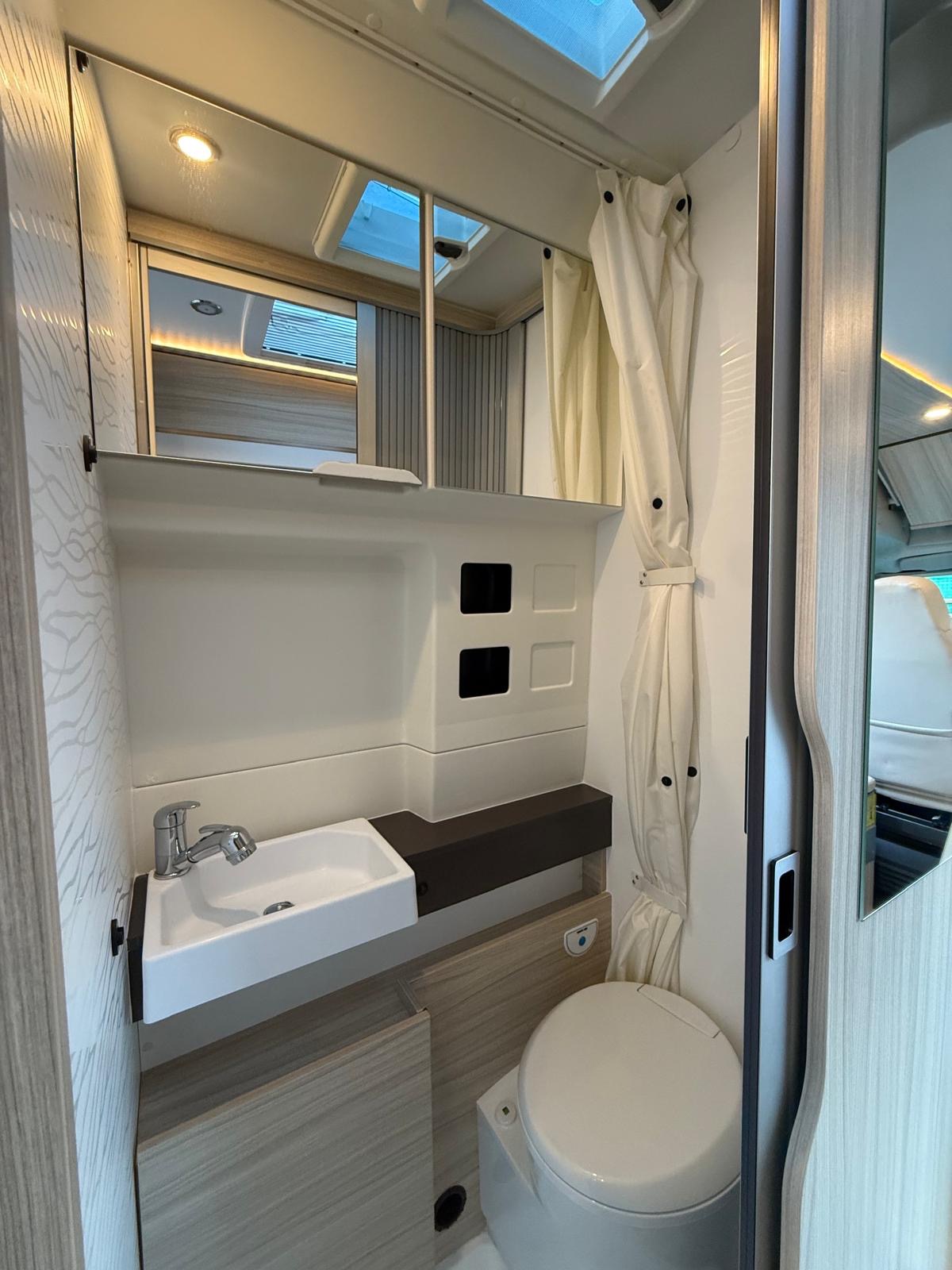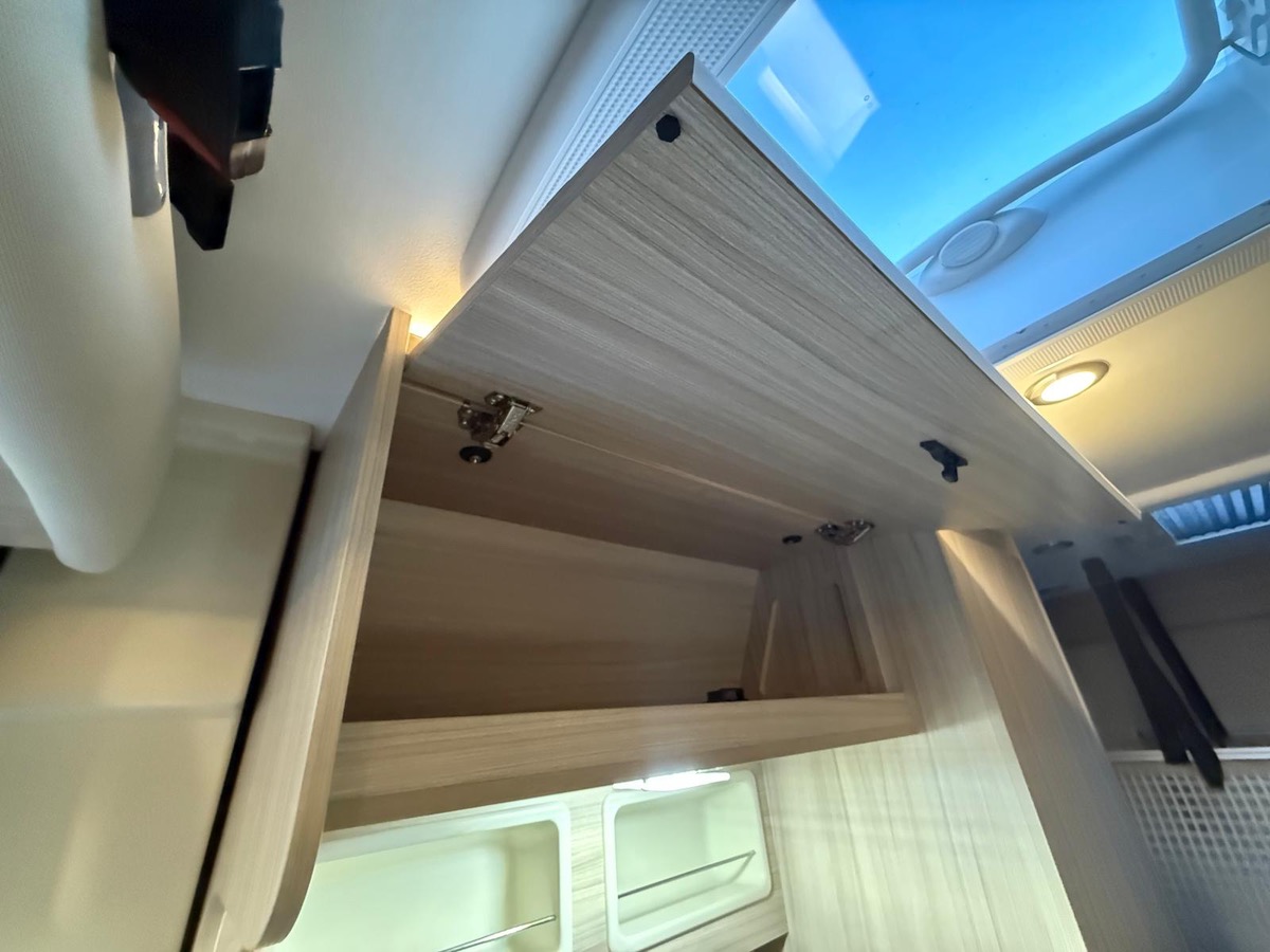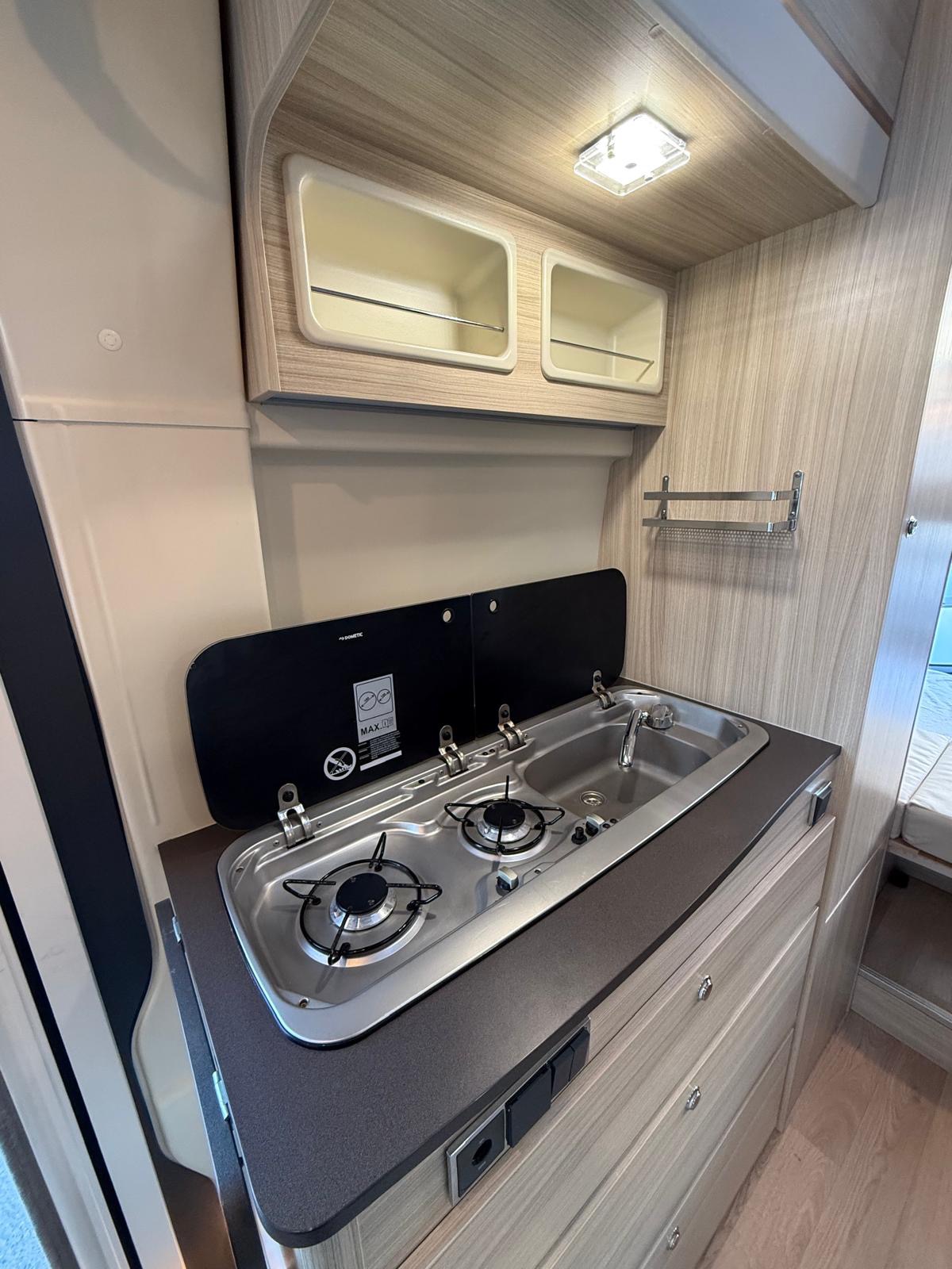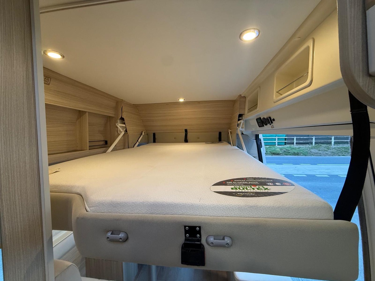 Fourgon aménagé familial comprenant un salon avant panoramique, une salle d’eau avec douche et WC, des lits superposés arrière avec salon enfant, une cuisine avec de nombreux rangements et un lit de pavillon 2 places. 5 places couchage et 5 places carte grise.