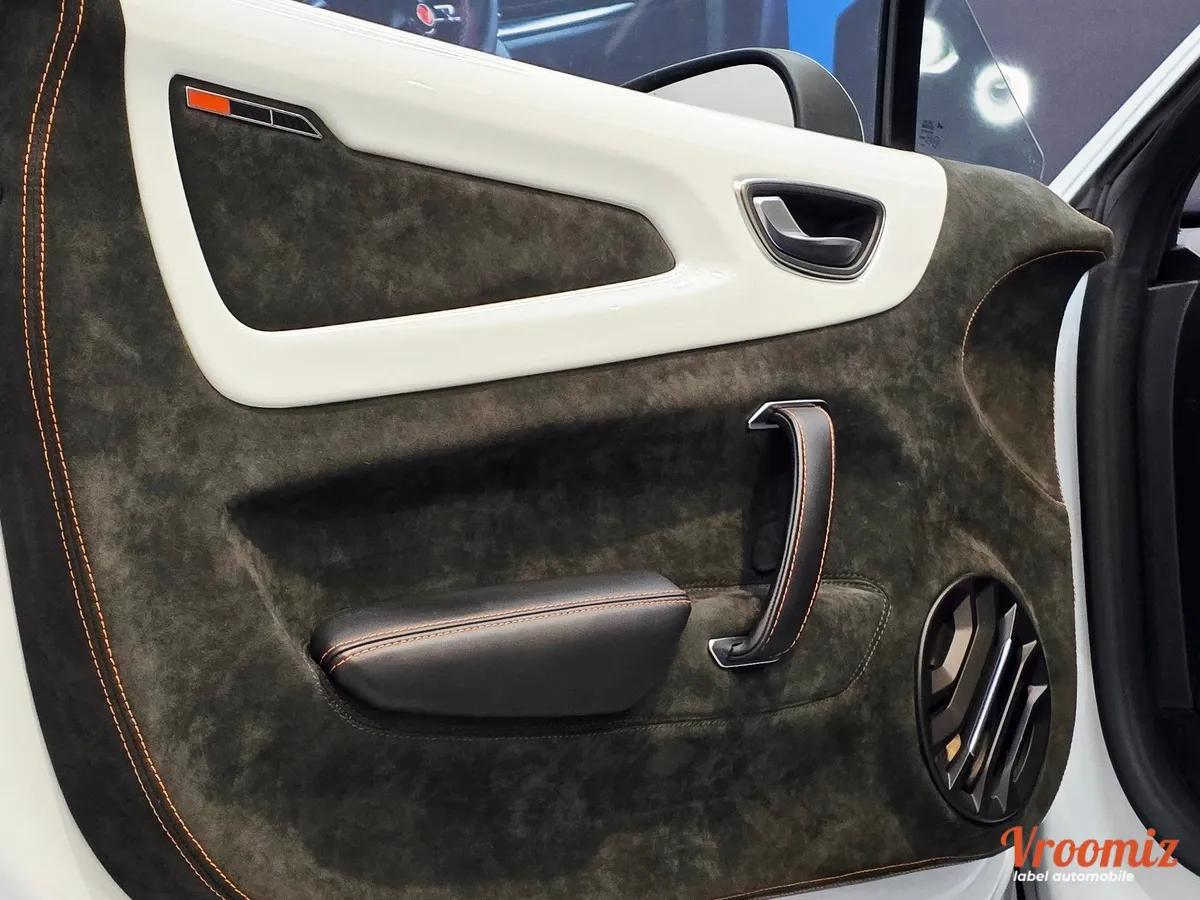 Le véhicule est dans un excellent état général et présente une configuration élégante et sportive, associant teinte Blanc Irisé et étriers orange avec surpiqûres assorties.