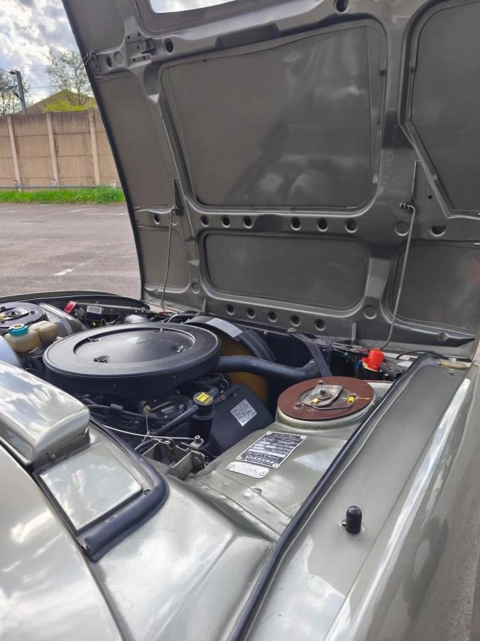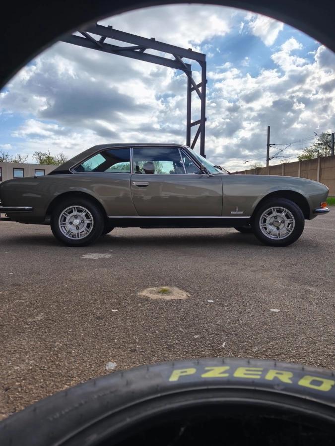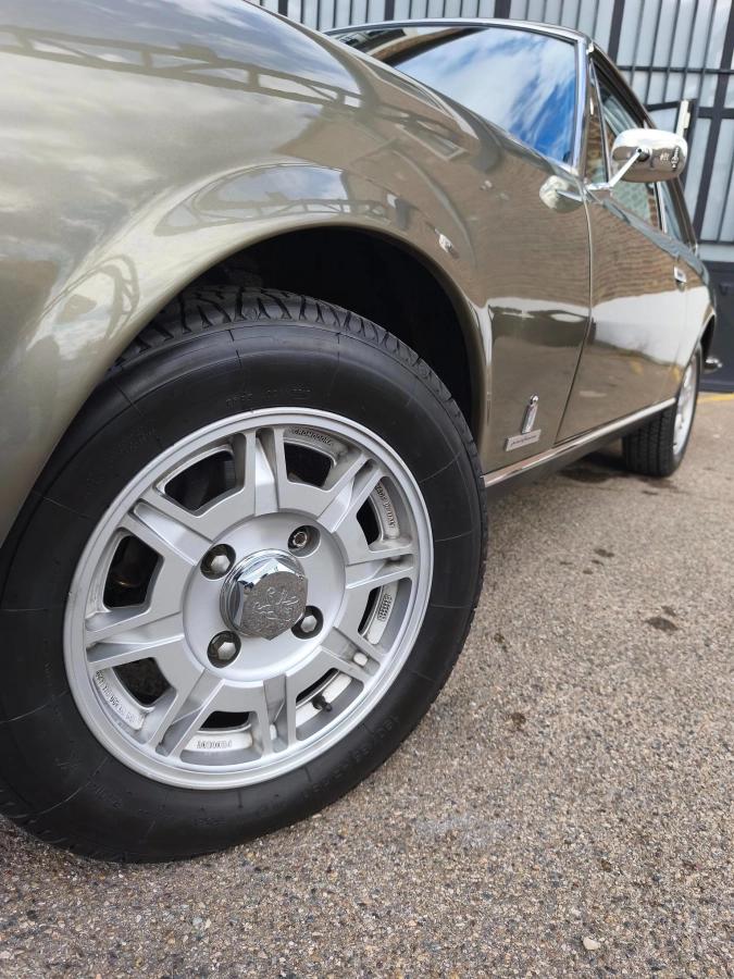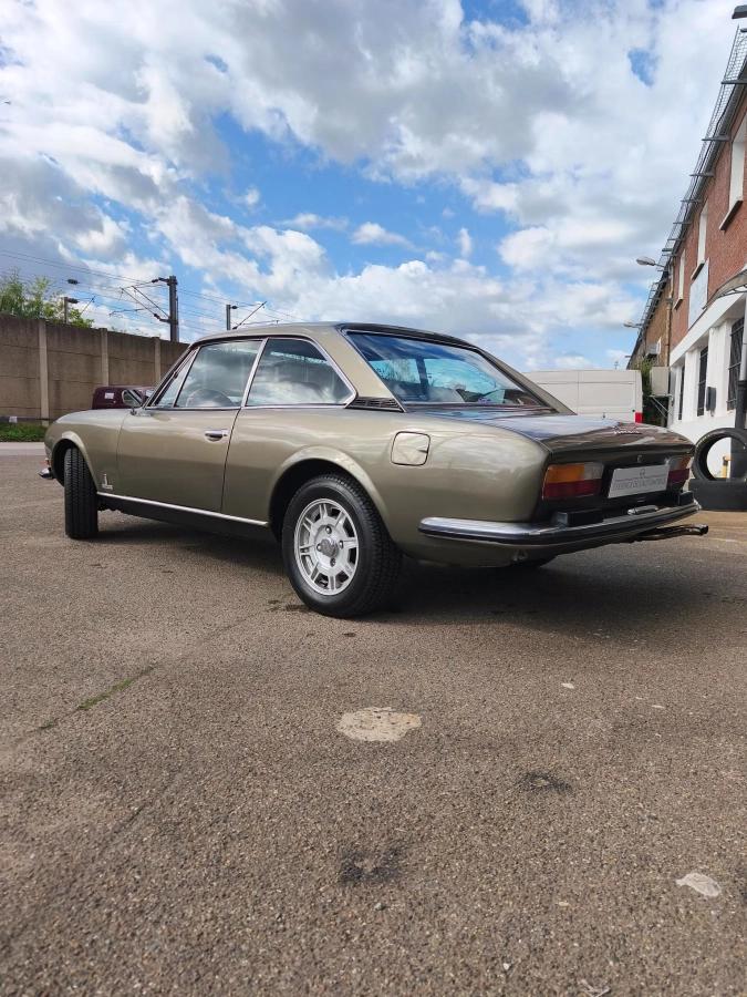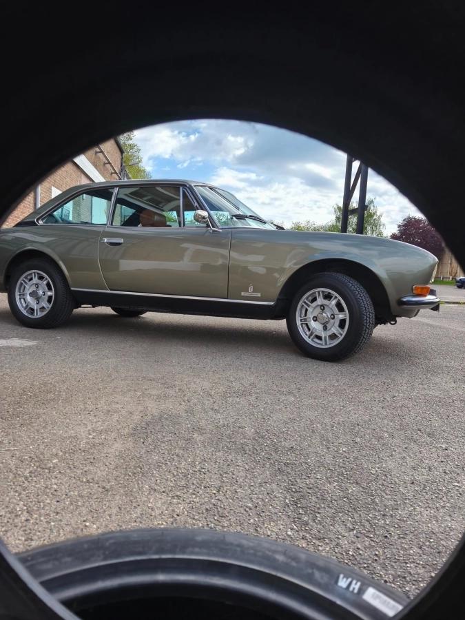 Notre très élégante Peugeot 504 coupé V6 de février 1975 boite mécanique 4 rapports de 136 ch dans sa teinte vert argenté et accompagné de son intérieur en simili cuir tabac brun lui rend sa plus belle configuration.