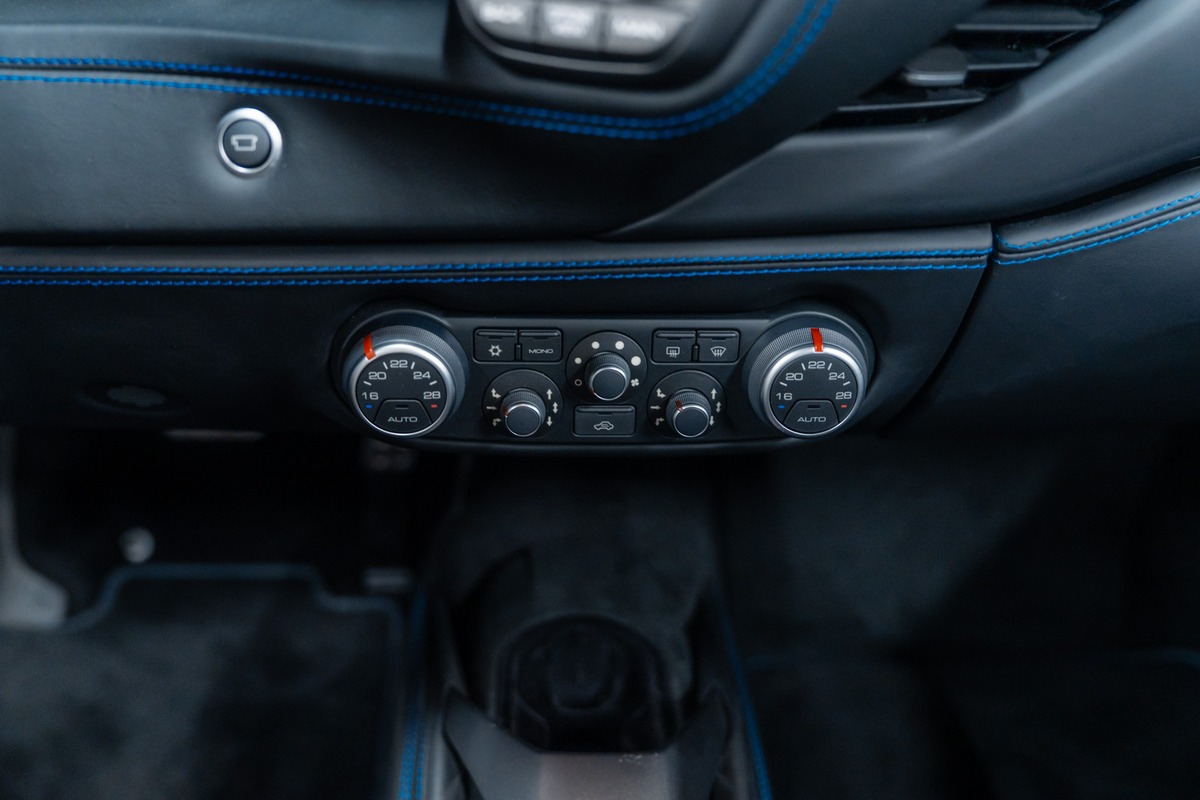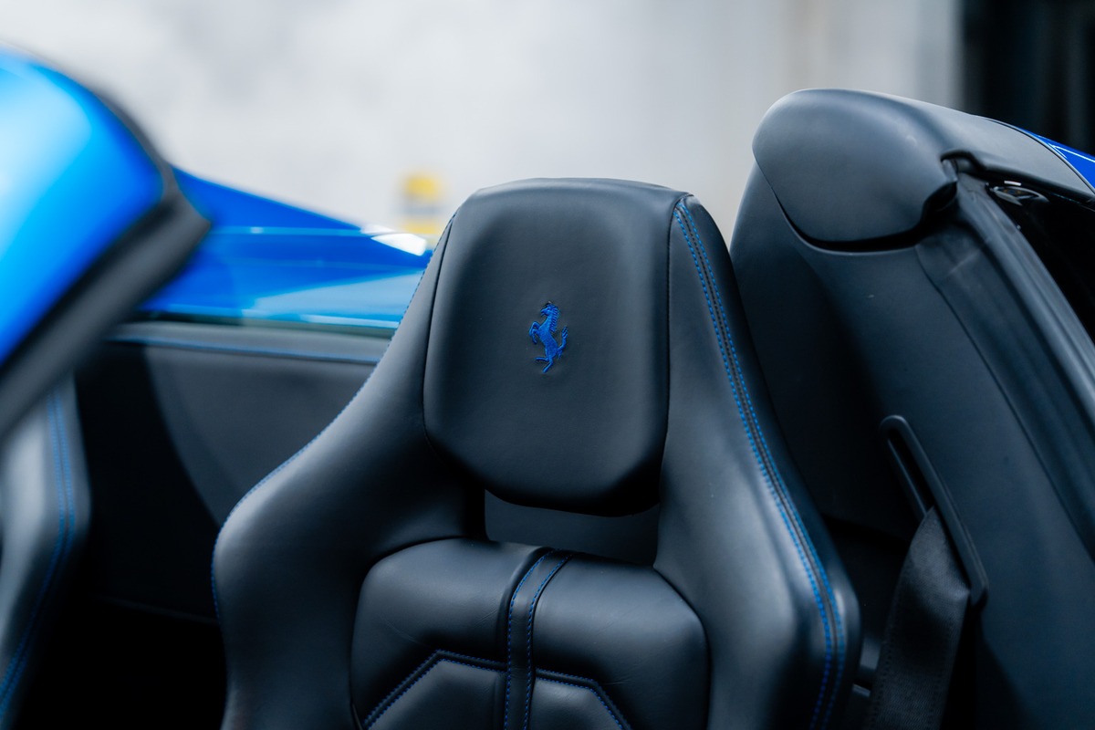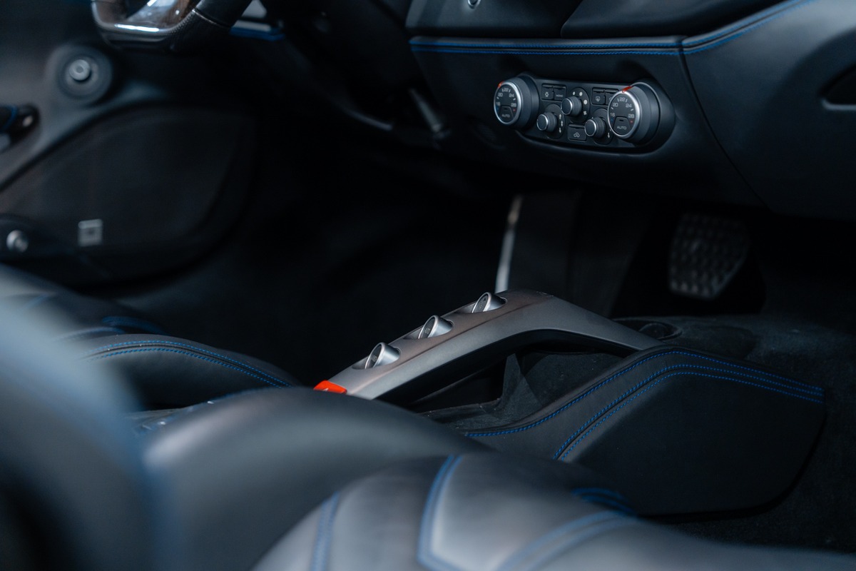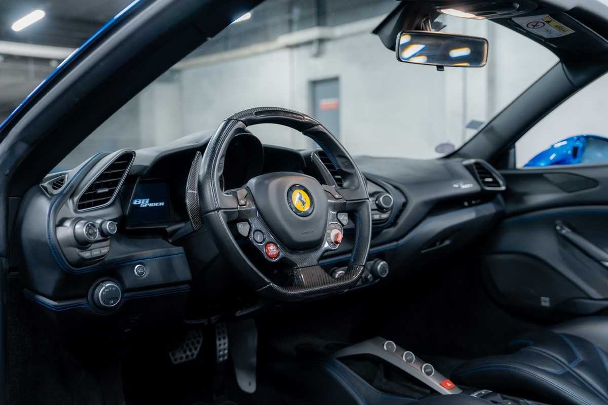 Présentée dans la teinte 422 – Blu Corsa, associée à un intérieur 8500 – Nero, cette 488 Spider offre une configuration à la fois élégante et fidèle à l’ADN de la marque. La carrosserie et l’habitacle sont en très bon état, tout comme l’ensemble de l’instrumentation de bord, qui fonctionne parfaitement.
