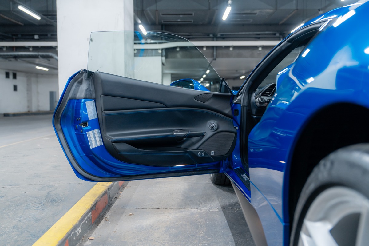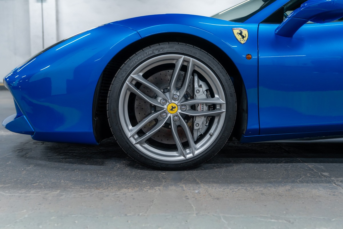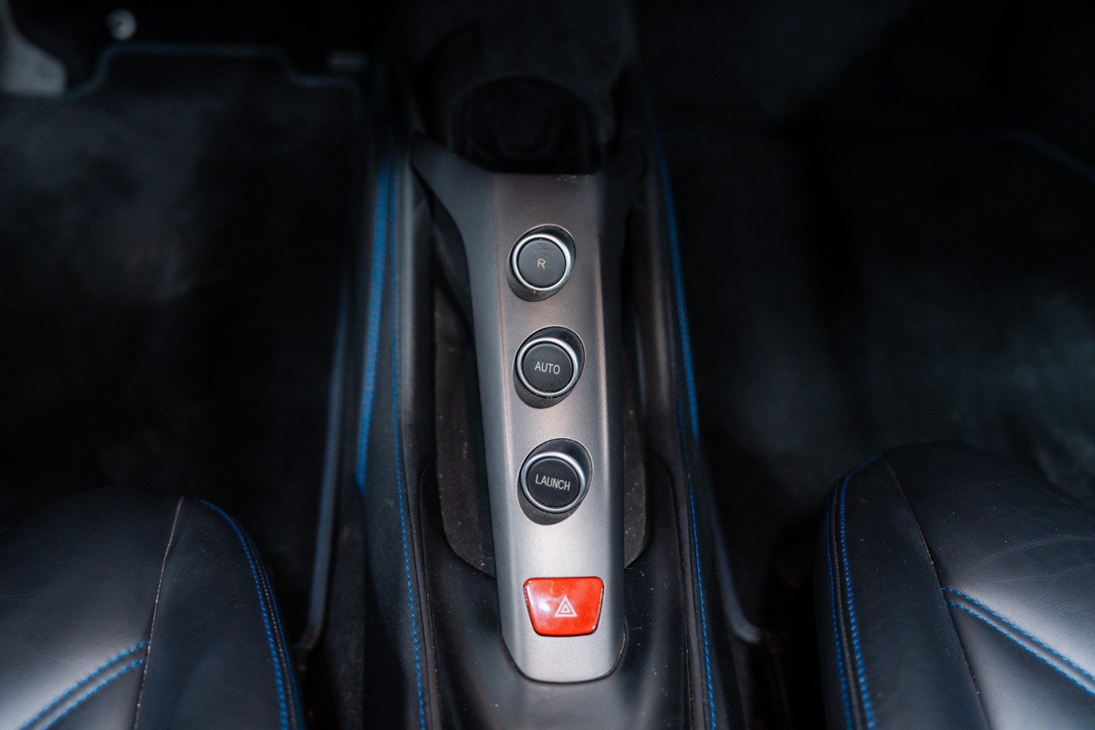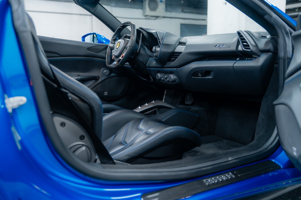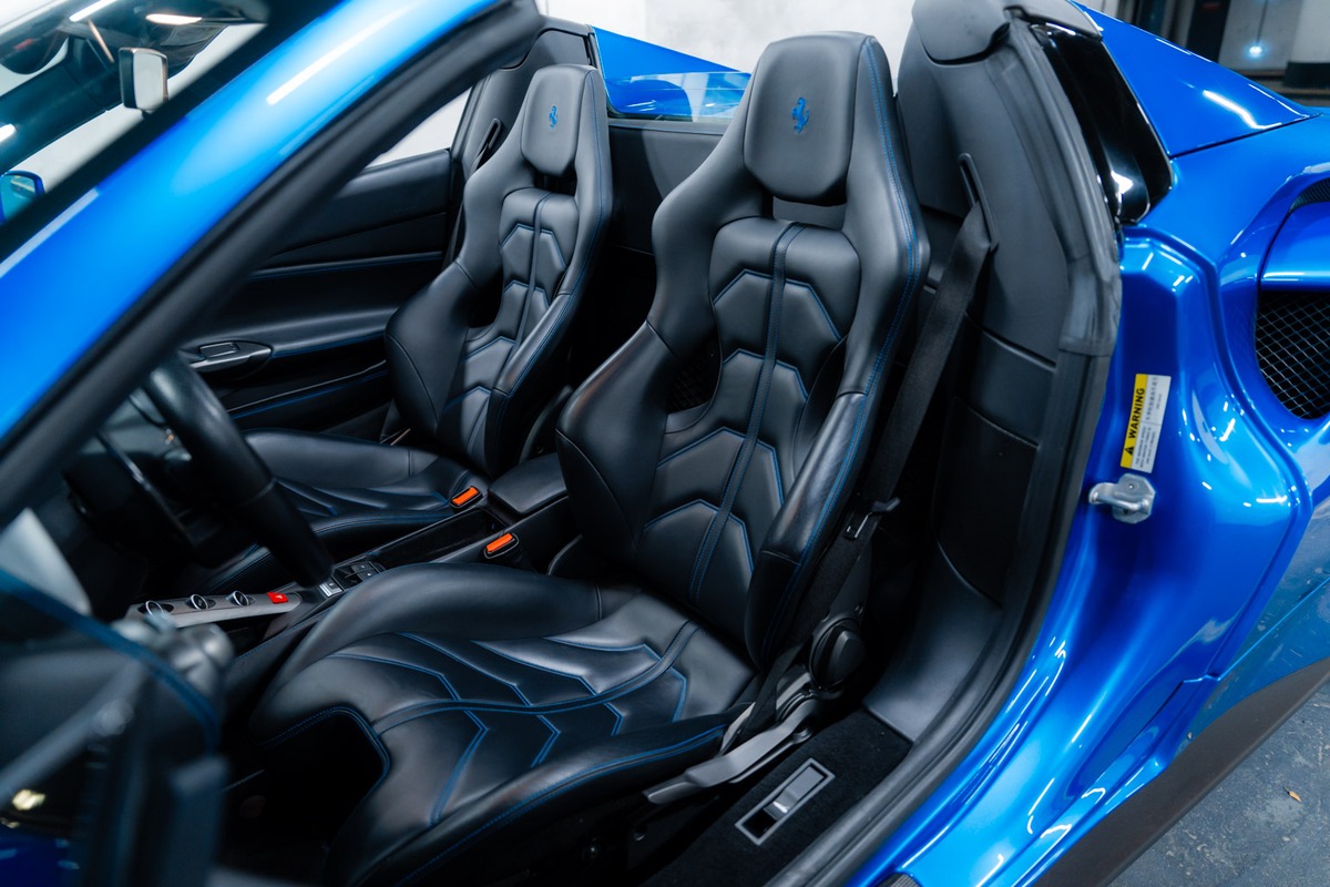 Présentée dans la teinte 422 – Blu Corsa, associée à un intérieur 8500 – Nero, cette 488 Spider offre une configuration à la fois élégante et fidèle à l’ADN de la marque. La carrosserie et l’habitacle sont en très bon état, tout comme l’ensemble de l’instrumentation de bord, qui fonctionne parfaitement.