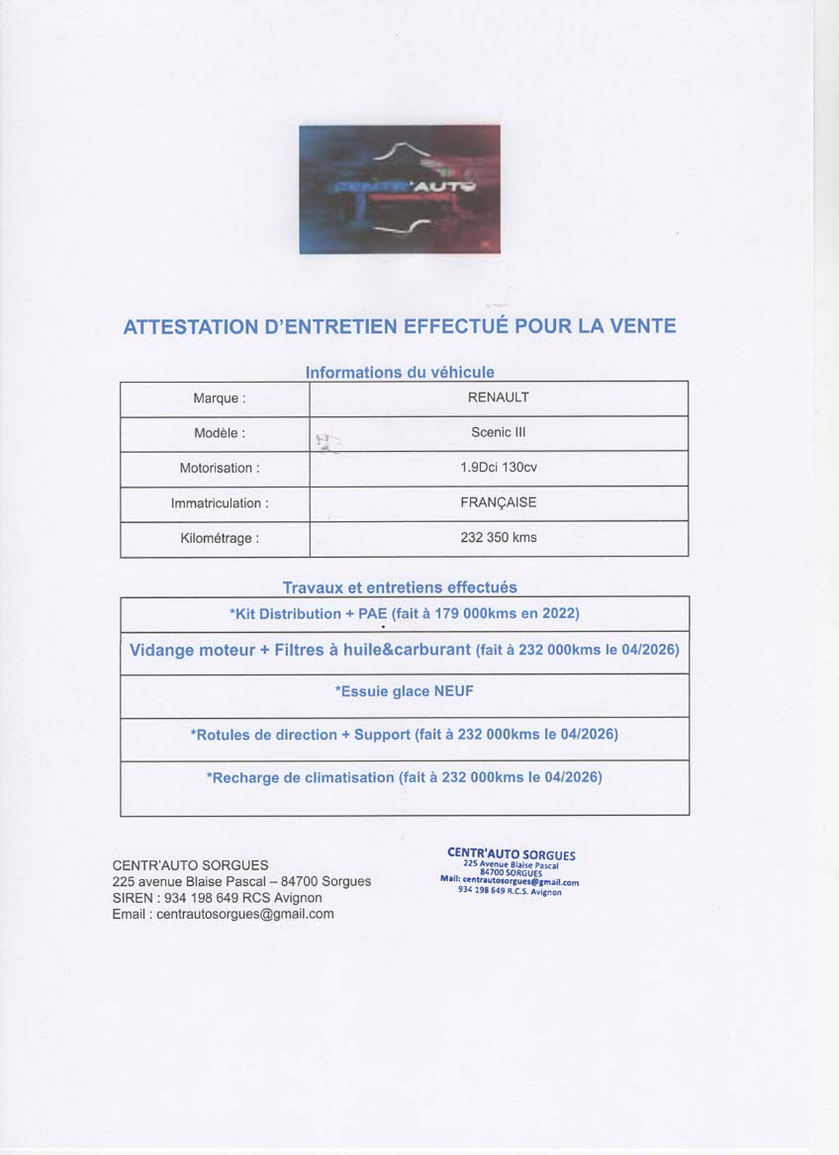 Bonjour, CENTR'AUTO SORGUES est spécialisé dans la mécanique, et vitrages automobiles ainsi que la vente de véhicules d'occasions de toutes marques, tous nos véhicules sont livrés réviser, nettoyer et contrôler dans nos ateliers avec une garantie de 3 mois pièces et main d’œuvre avec possibilités d'extension de garantie.