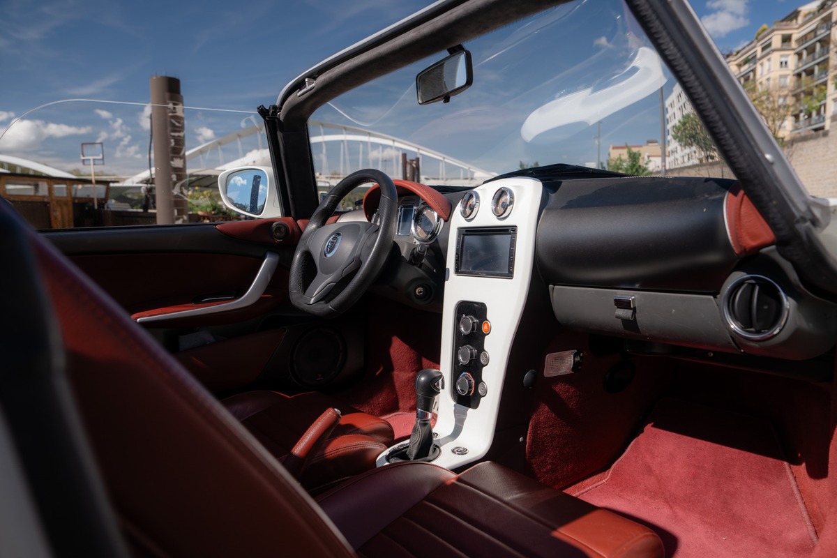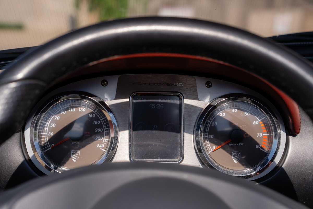 Notre PGO Speedster II 1.6 Turbo, mise en circulation le 29 juillet 2014, totalise aujourd’hui 20 500 km. D’origine luxembourgeoise, elle est actuellement immatriculée en France et a connu deux propriétaires, dont l’actuel depuis 2019, qui l’a acquise directement auprès du constructeur PGO.