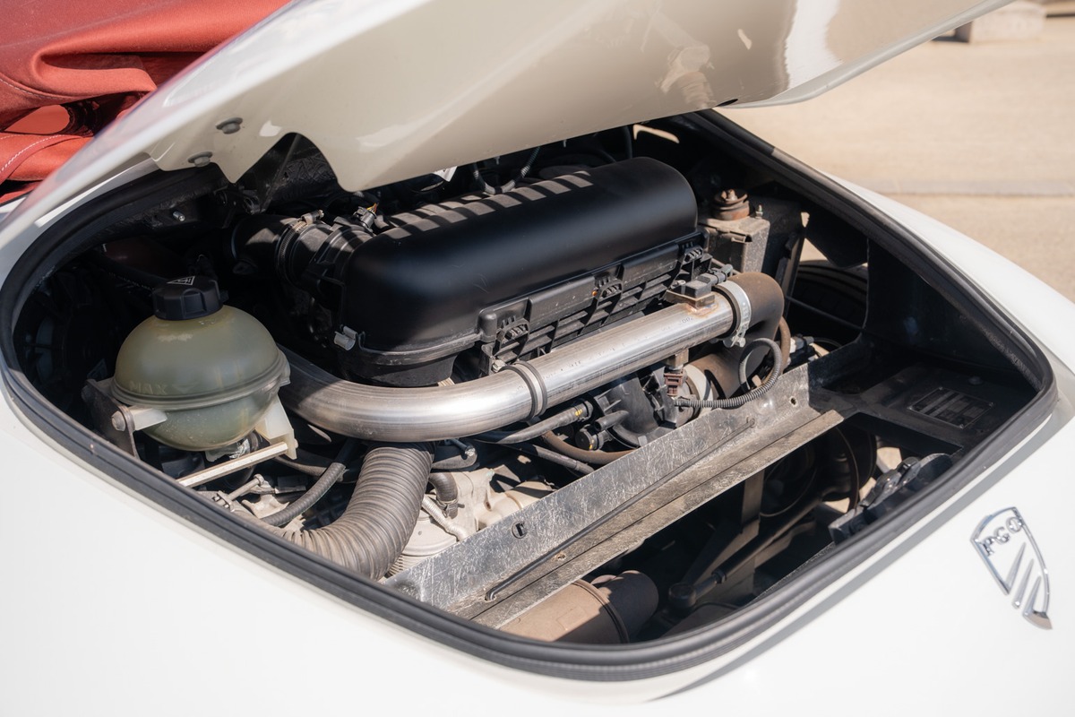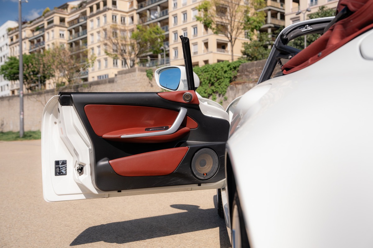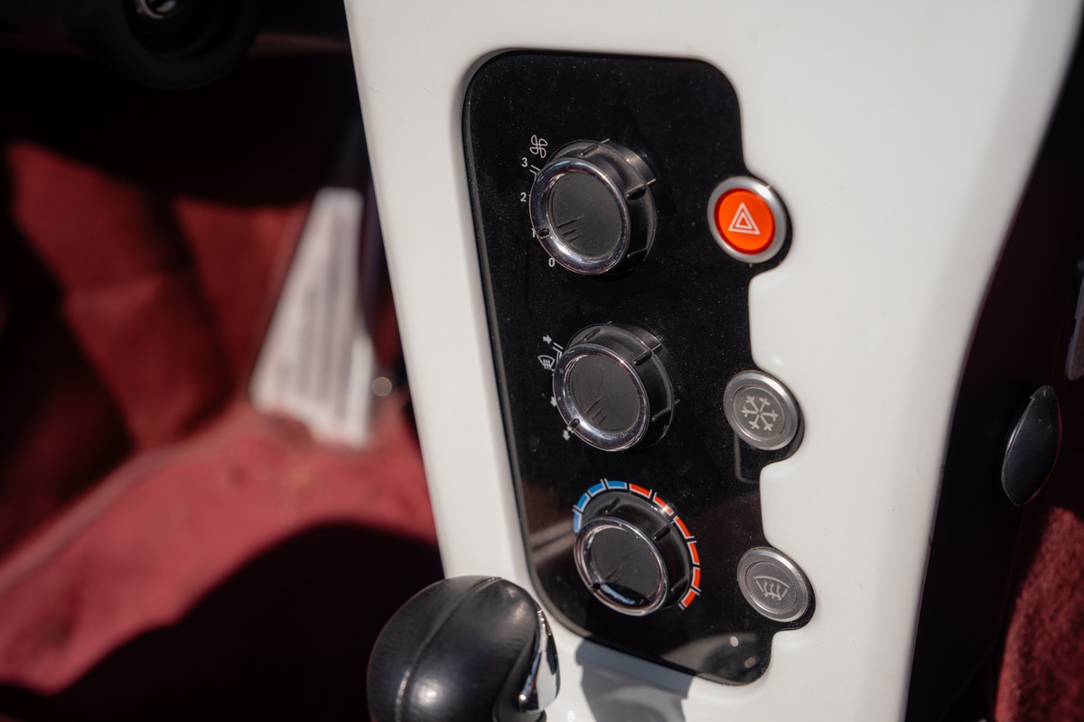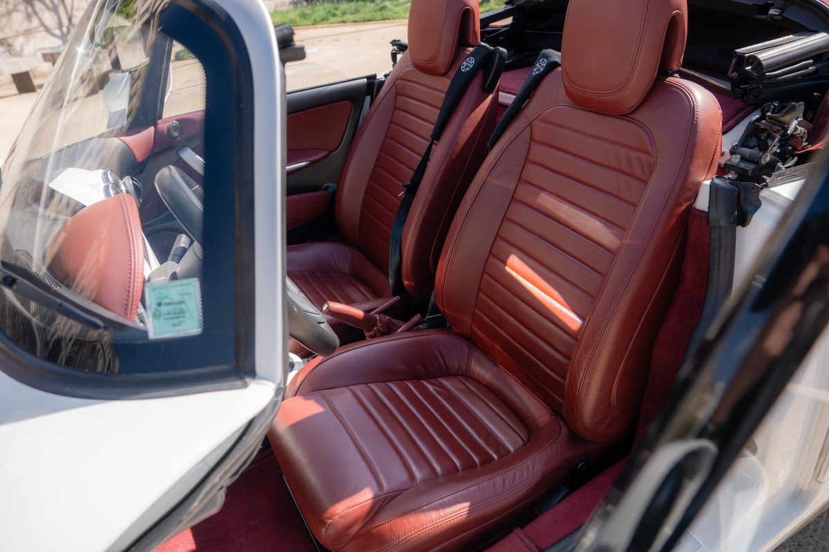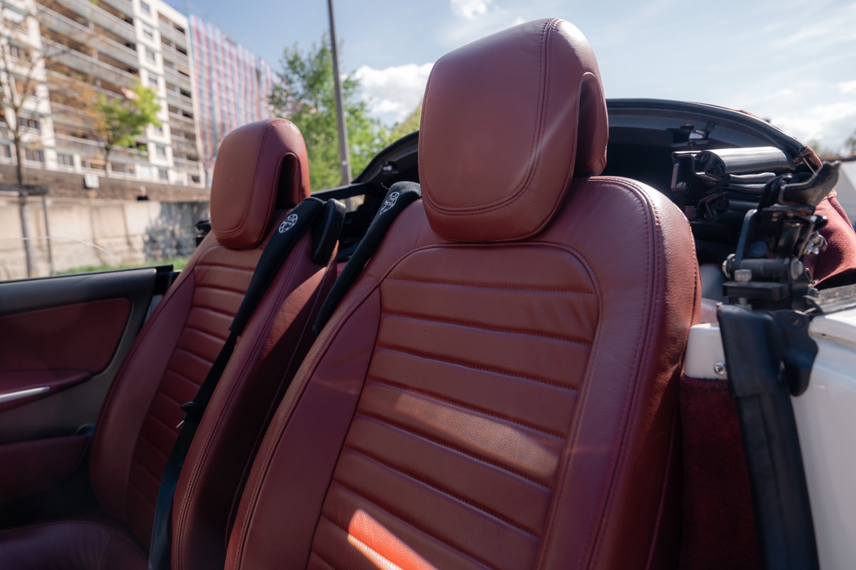 Cet exemplaire se présente dans une teinte Blanc, associée à un intérieur en cuir Bordeaux. La carrosserie est en très bon état général, sans défaut à signaler. L’habitacle est également en excellent état, tout comme l’instrumentation de bord, parfaitement fonctionnelle.