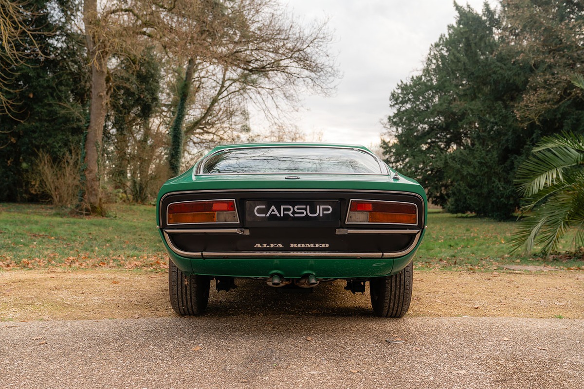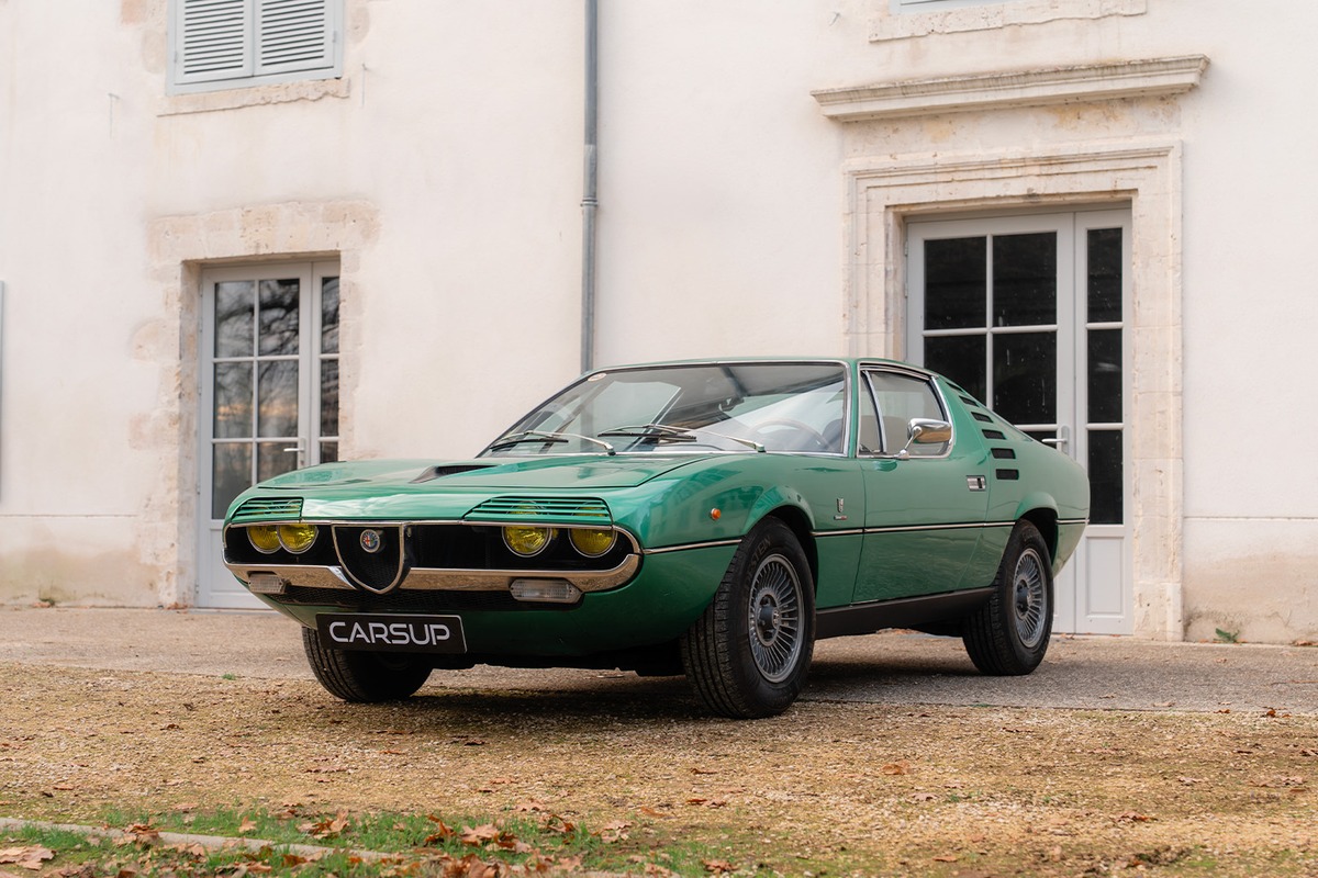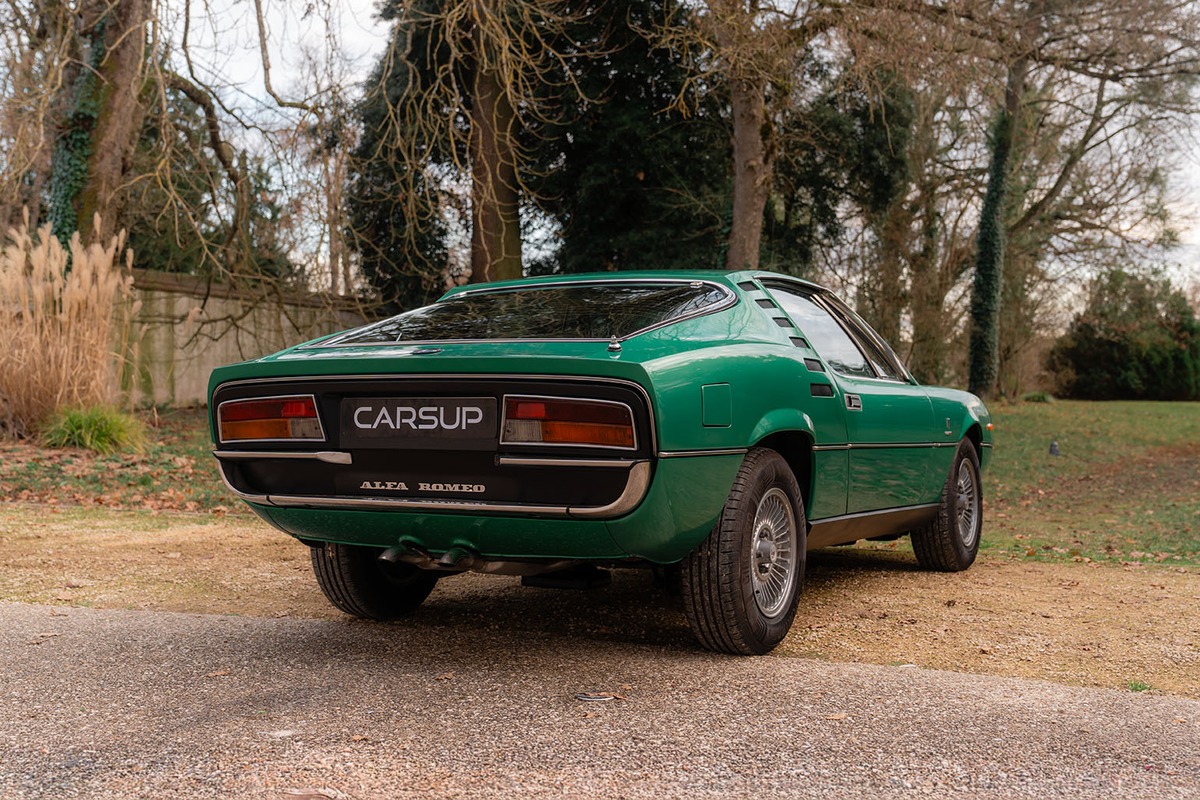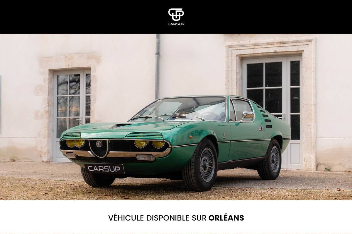 Le concept, dessiné par Marcello Gandini chez Bertone, utilisait un moteur 1,6 litre et le châssis de la Giulia Sprint GT. La version de série, dévoilée au Salon de Genève en 1970, évolue significativement. Elle embarque un V8 de 2,6 litres dérivé de celui des prototypes Alfa Tipo 33, développant environ 200 chevaux. Ce moteur est associé à une boîte manuelle ZF à cinq rapports et un différentiel à glissement limité.