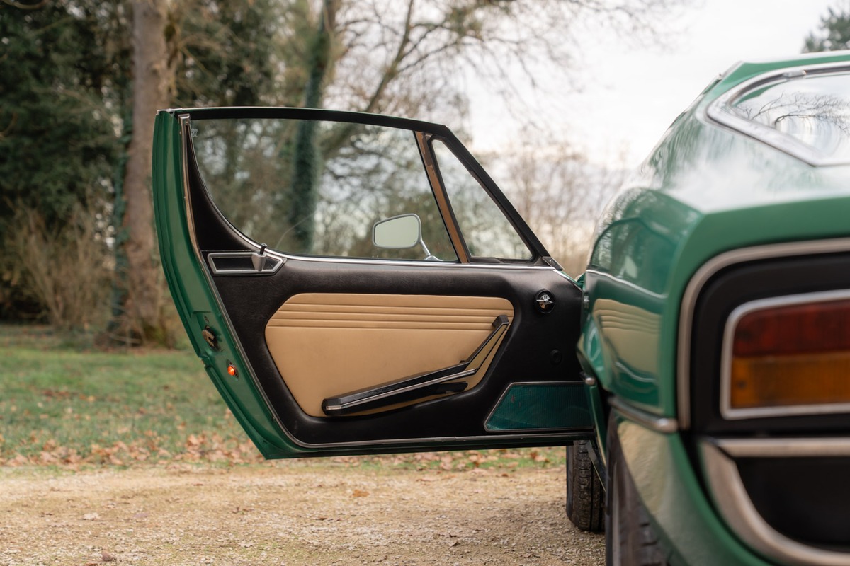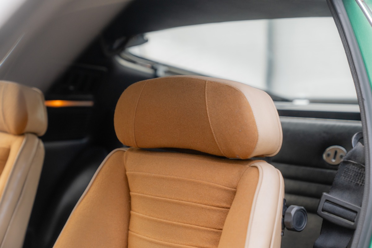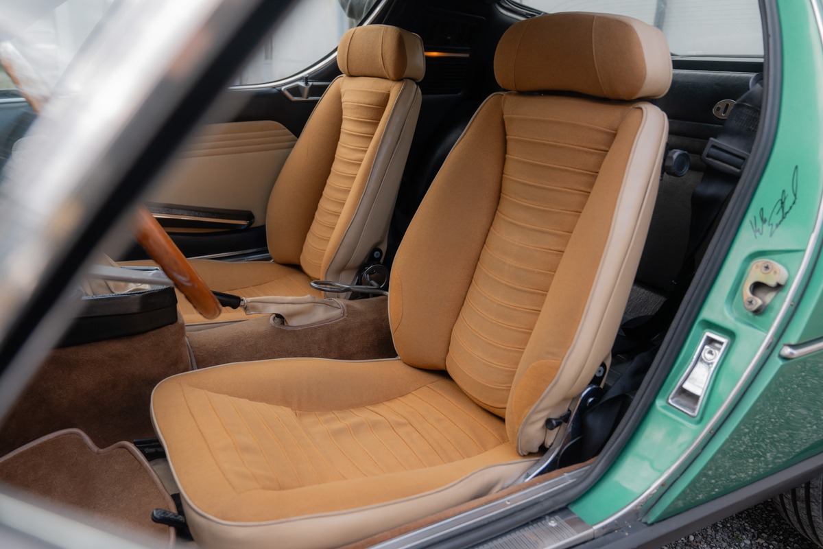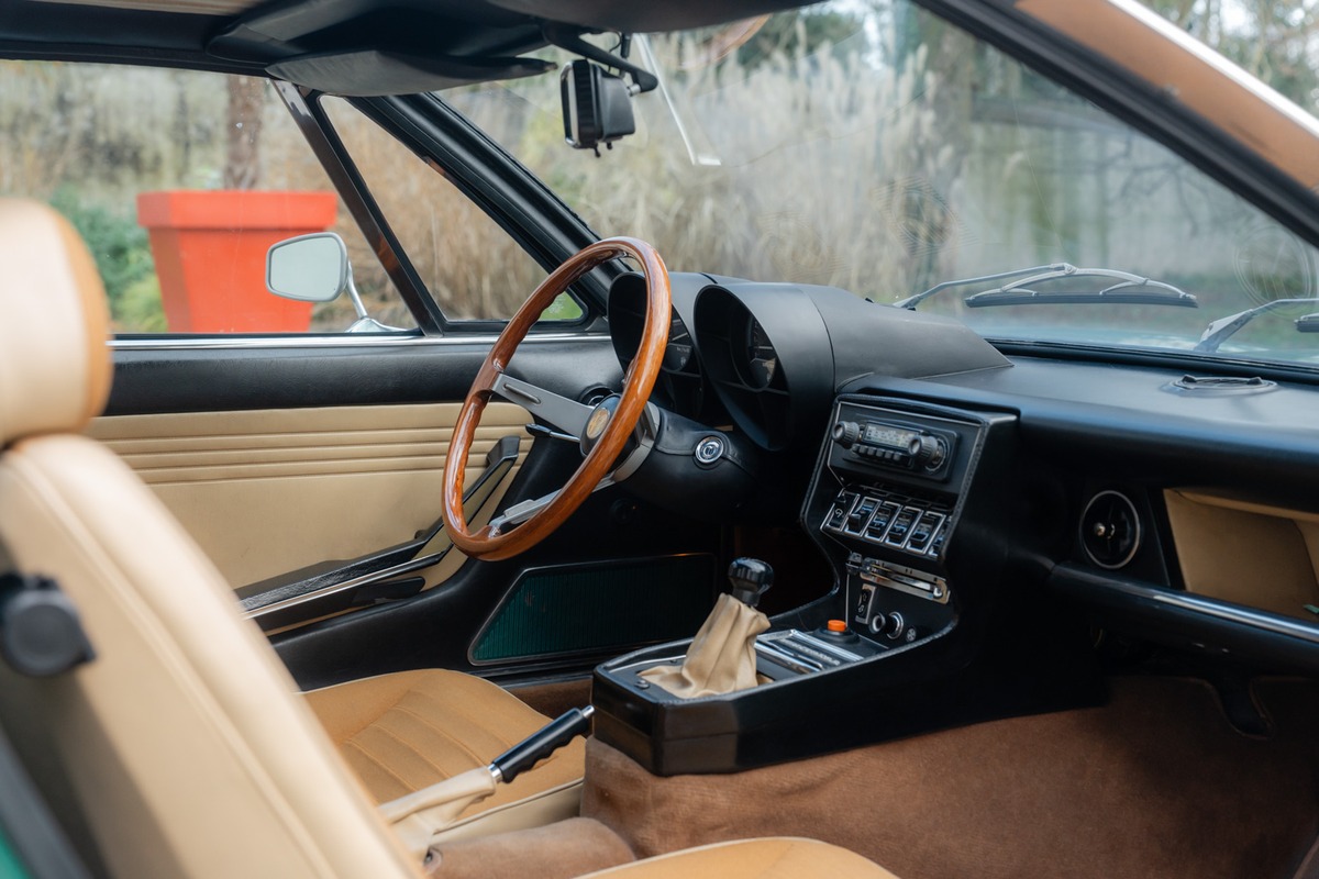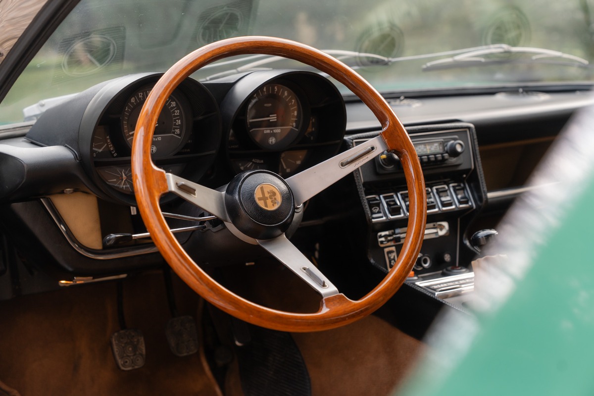 Cette Alfa se présente dans sa très recherchée teinte Vert Montréal, associée à un intérieur couleur écureuil, dans un superbe état de présentation. La sellerie est d’origine, avec uniquement une légère retouche réalisée sur le siège conducteur. La carrosserie, en peinture d’origine également, présente quelques éclats et zones où la laque travaille, un état cohérent avec une présentation non restaurée et fidèle à l’origine.