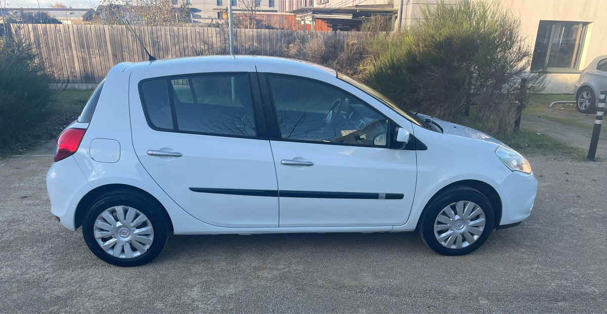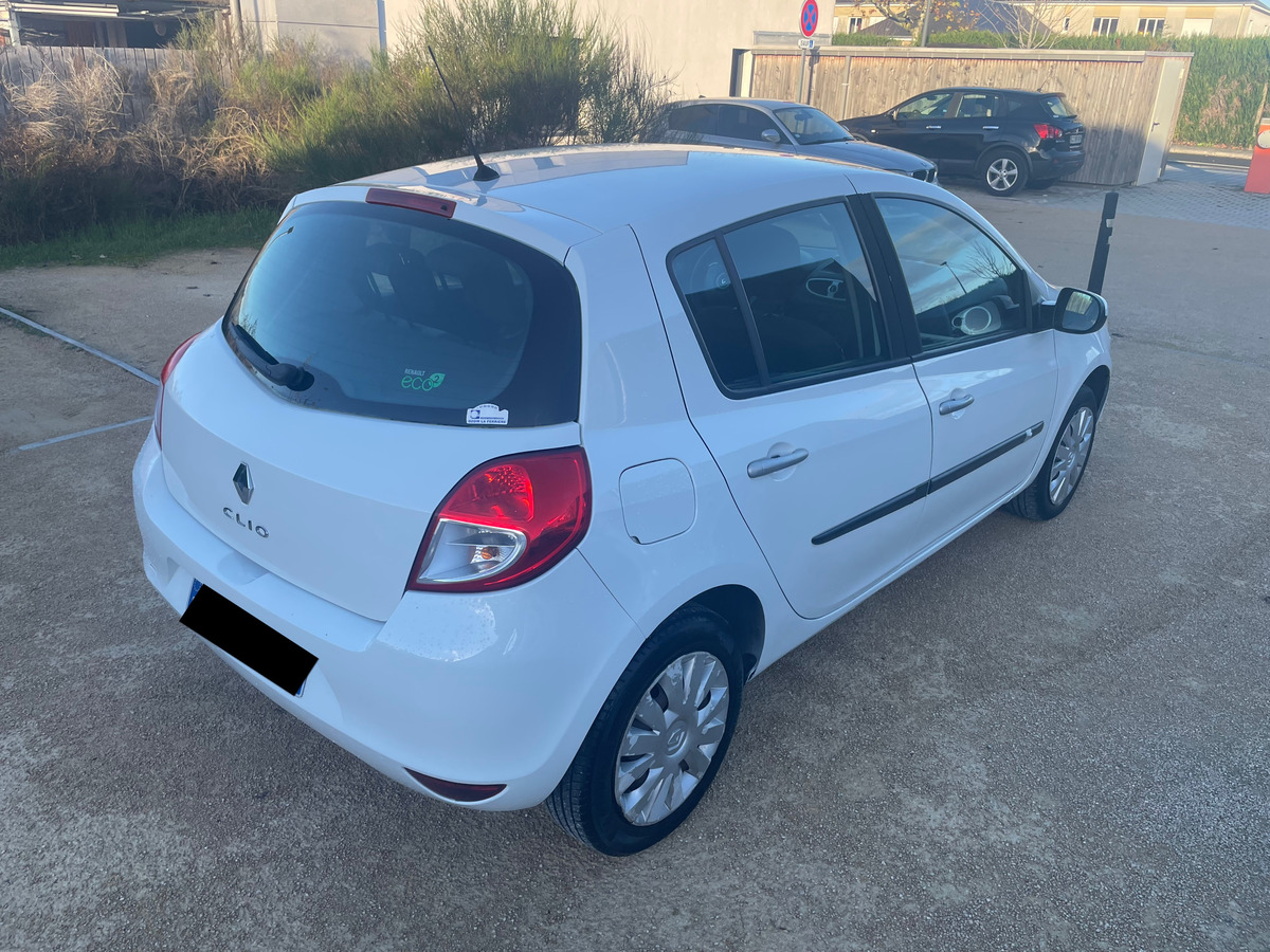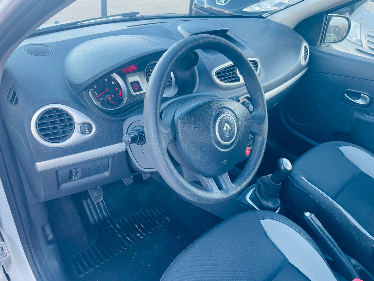 Renault Clio III PHASE 2- 1.2 16V 75 CH ECO2 EXPRESSION CLIM EURO 5 / anné: 2011 : Blanc Métallique : Essence: 155 000 km : Citadine : Boite de vitesse manuelle / intérieur noir: 4 cv / 5 Portes