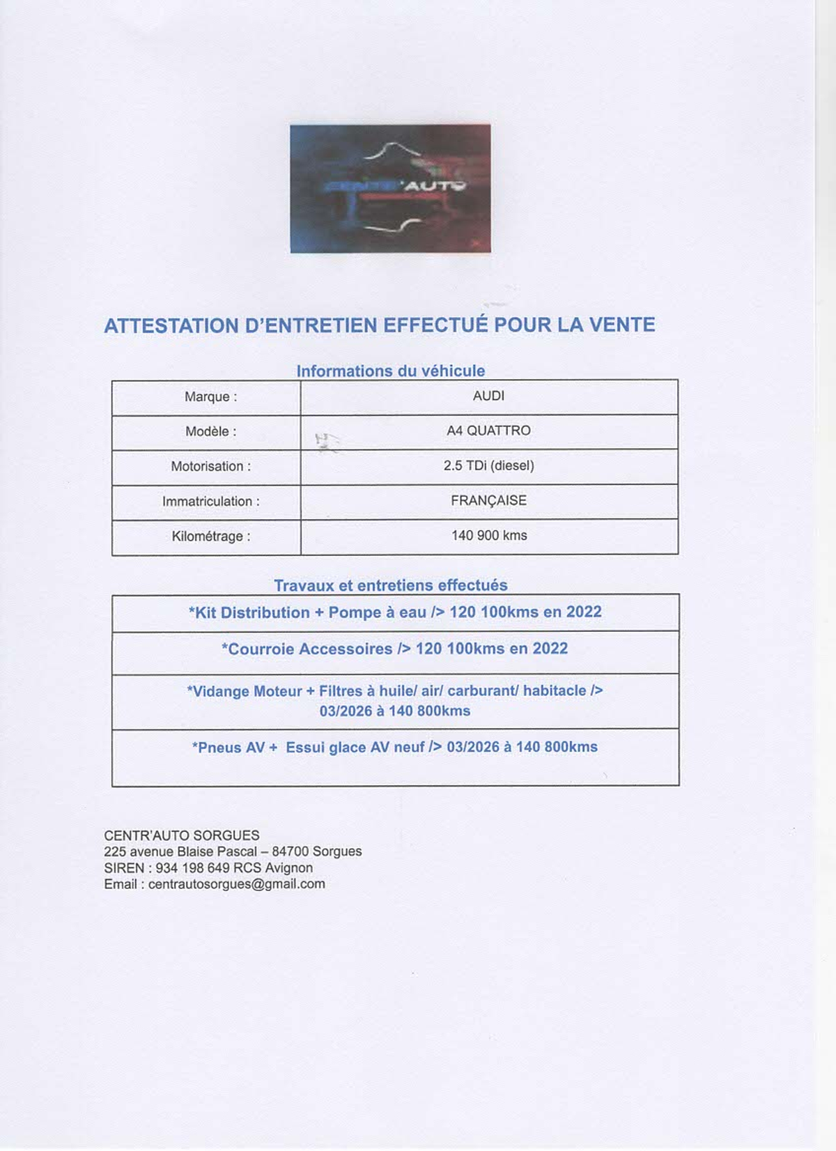Bonjour, CENTR'AUTO SORGUES est spécialisé dans la mécanique, et vitrages automobiles ainsi que la vente de véhicules d'occasions de toutes marques, tous nos véhicules sont livrés réviser, nettoyer et contrôler dans nos ateliers avec une garantie de 3 mois pièces et main d’œuvre avec possibilités d'extension de garantie.